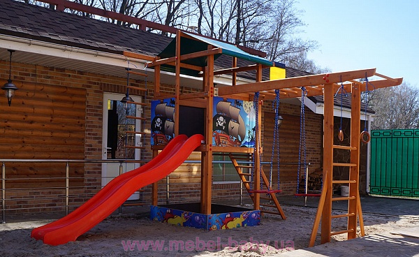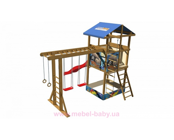 Конструкция изготовлена из долговечной и прочной сосны, выдерживающей нагрузки до 80 кг. Комплекс включает несколько лестниц, кольца для подтягивания, маленькую песочницу, качели и домик для игр. Рекомендуется для детей младшего возраста, которые будут заняты не только игрой, но и смогут укреплять свое физическое здоровье и силу.