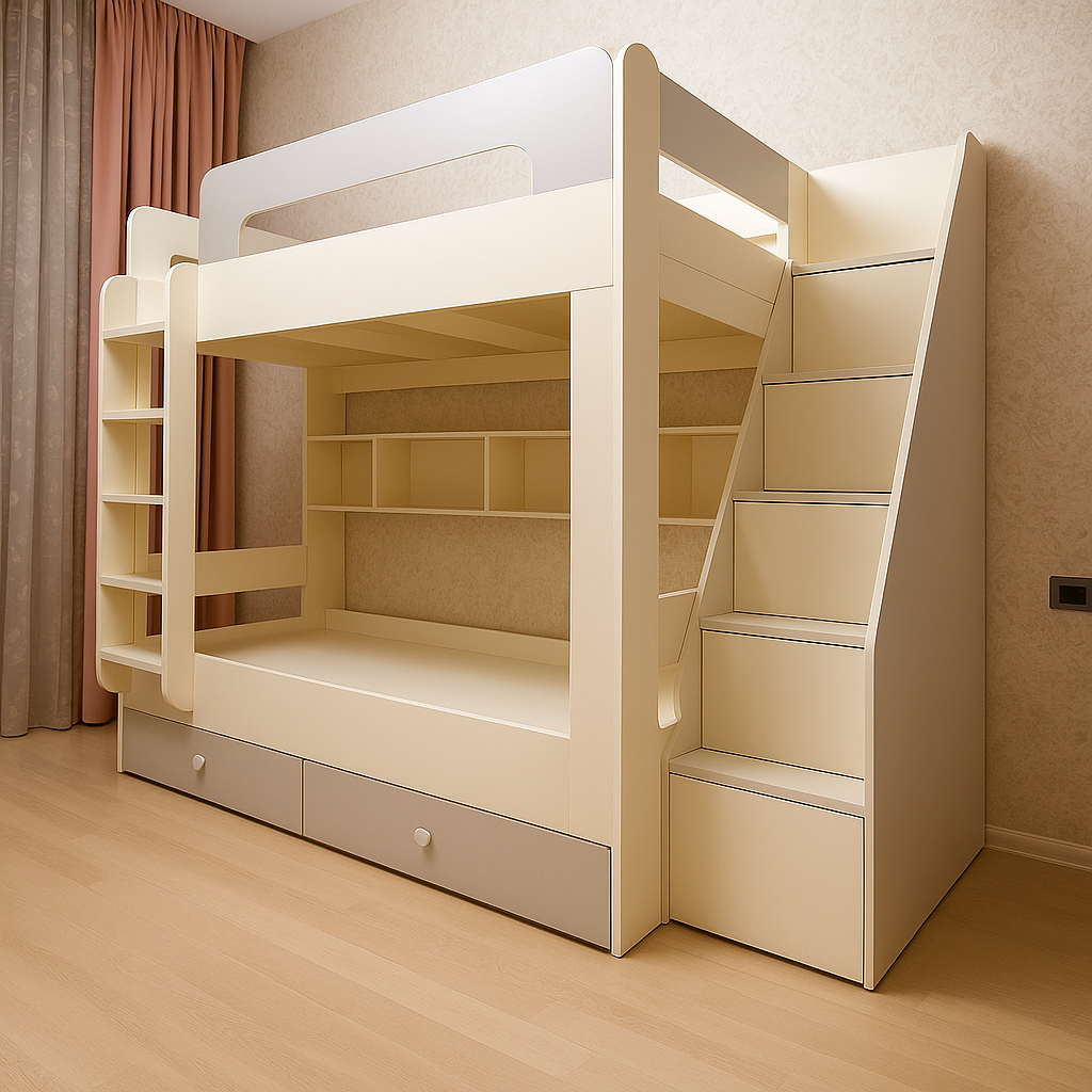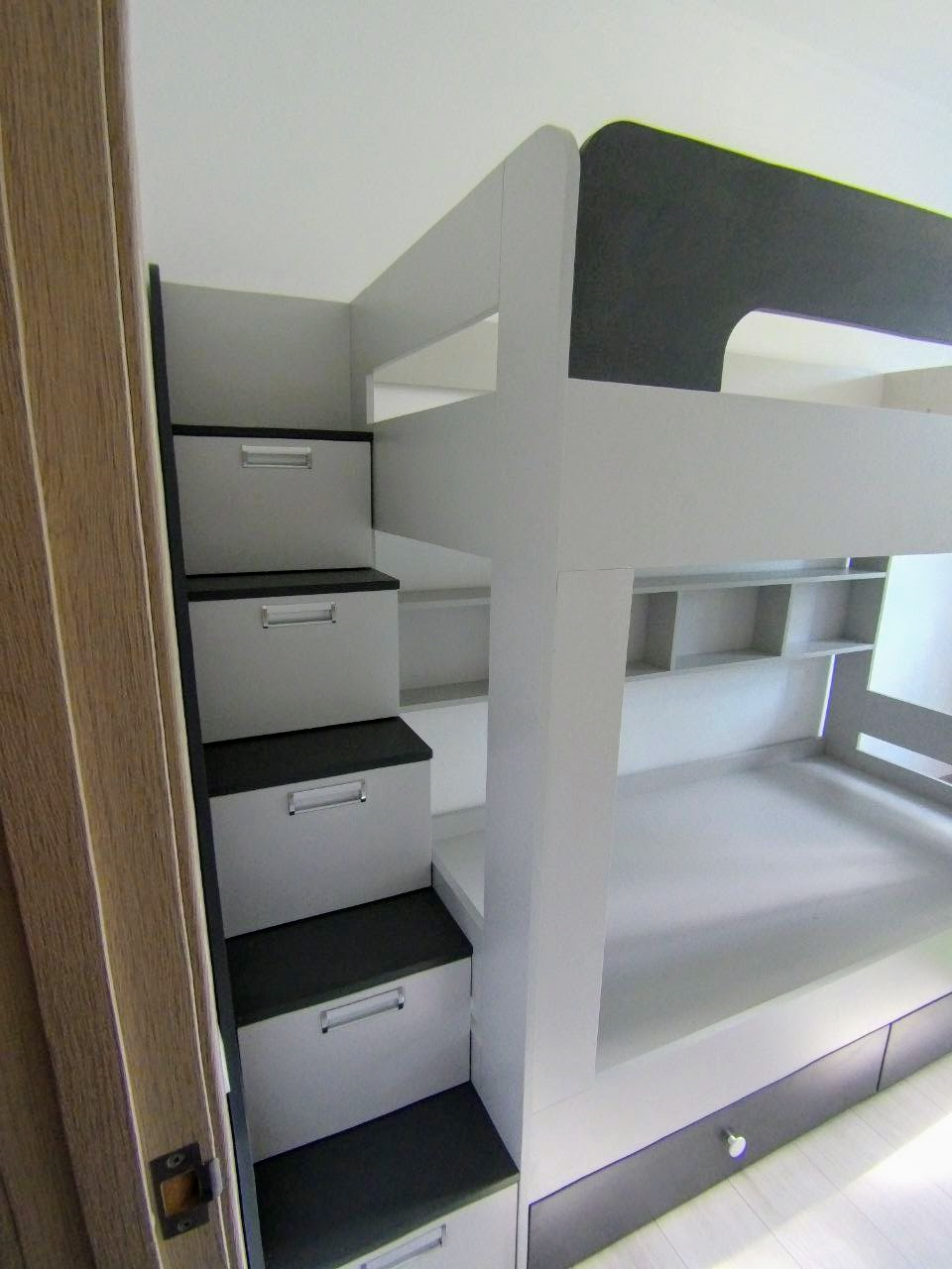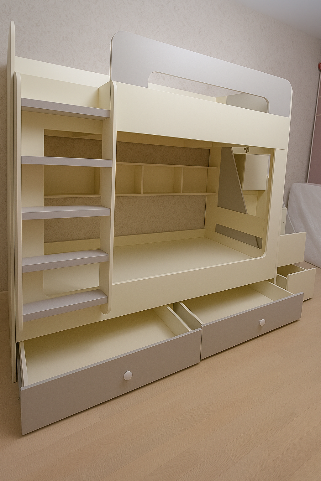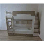 2. Стандарт: ДСП 18 мм, кромка 2 и 1 мм, телескопические направляющие, классические петли, присутствуют декоративные вырезы, скругления в столах, полочках, бортах, ступеньках. Мебель выглядит как на фото и является более интересной и комфортной. Ящики закрываются более тихо и плавно. Используется высококачественная фурнитура ТМ Muller, которая имеет гарантию 10 лет. Рекомендованная нагрузка на спальное место до 120 кг.