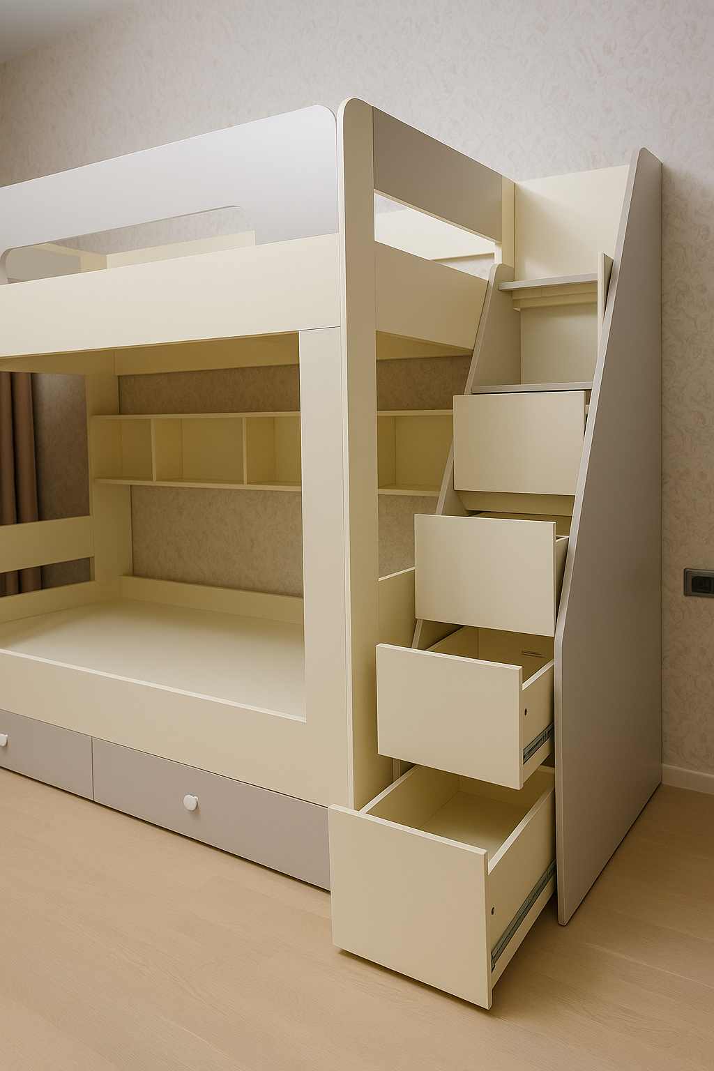 3. Стандарт+: ДСП 18 мм, кромка 2 и 1 мм, телескопические направляющие с доводчиком, петли с доводчиком, присутствуют декоративные вырезы, скругления в столах, полочках, бортах, ступеньках. Мебель не только выглядит и является массивной и презентабельной, но также она становится максимально комфортной в использовании — ящики закрываются почти сами - их нужно только слегка толкнуть, двери не хлопают при закрывании. Используется высококачественная фурнитура ТМ Muller, которая имеет гарантию 10 лет. Рекомендованная нагрузка на спальное место до 120 кг.