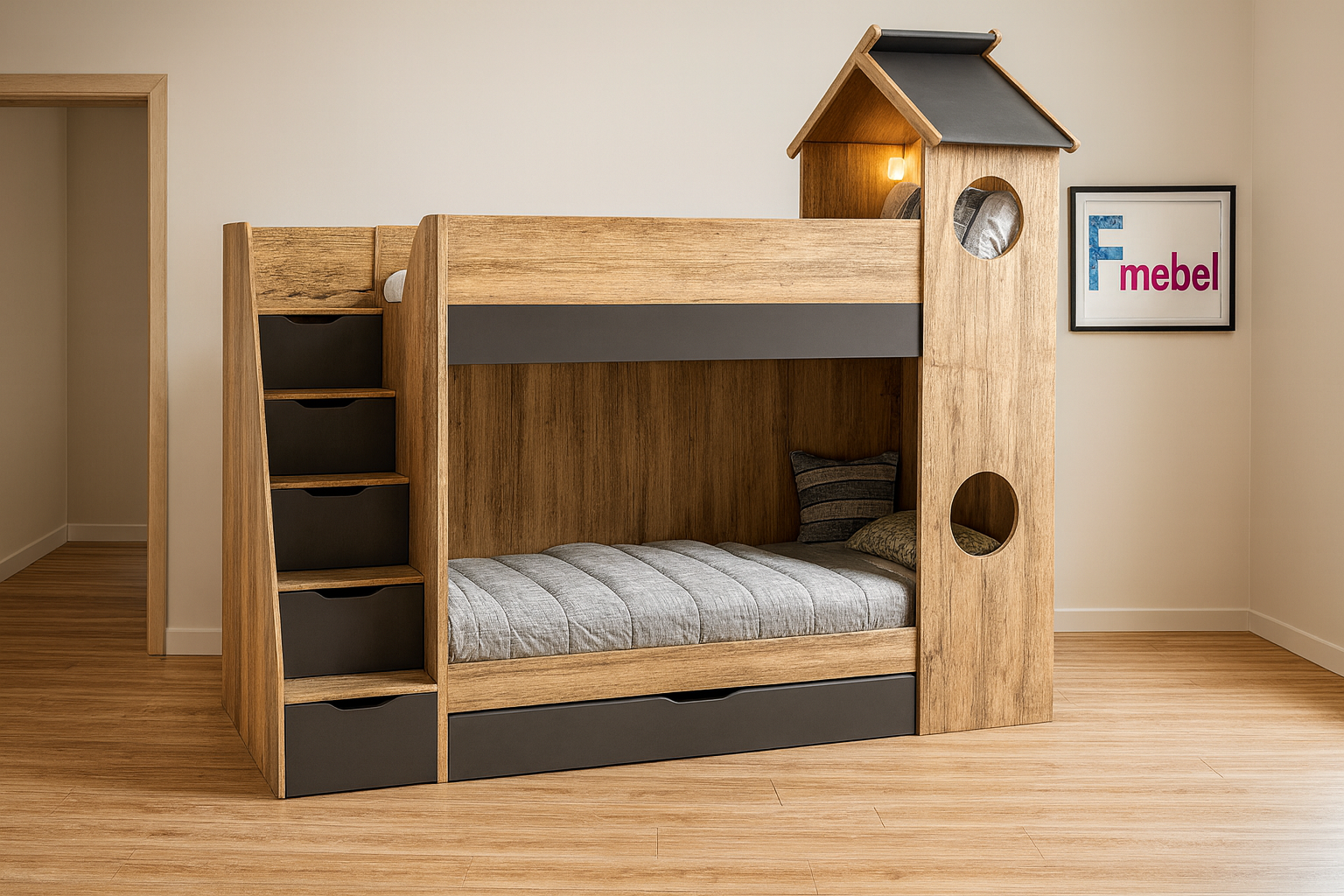 2. Стандарт: ДСП 18 мм, кромка 2 и 1 мм, телескопические направляющие, классические петли, присутствуют декоративные вырезы, скругления в столах, полочках, бортах, ступеньках. Мебель выглядит как на фото и является более интересной и комфортной. Ящики закрываются более тихо и плавно. Используется высококачественная фурнитура ТМ Muller, которая имеет гарантию 10 лет. Рекомендованная нагрузка на спальное место до 120 кг.