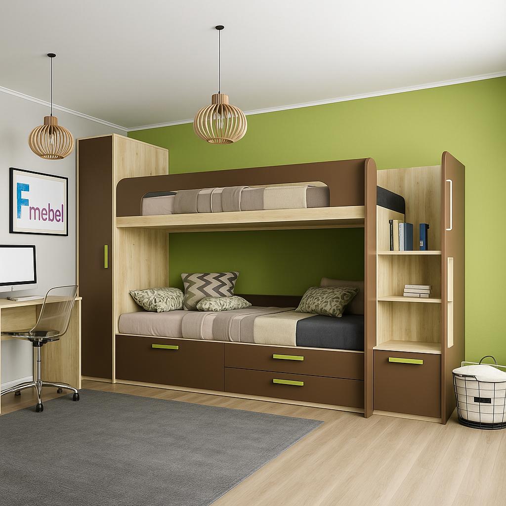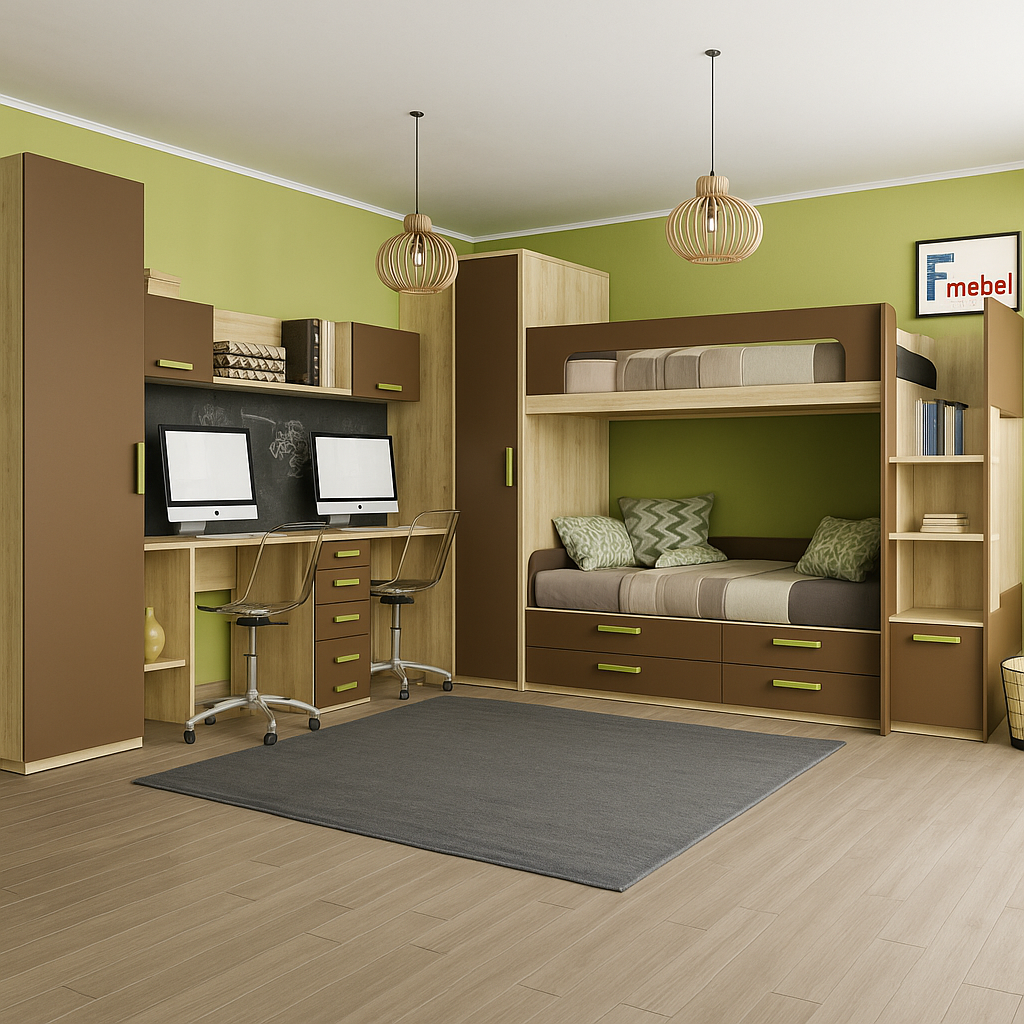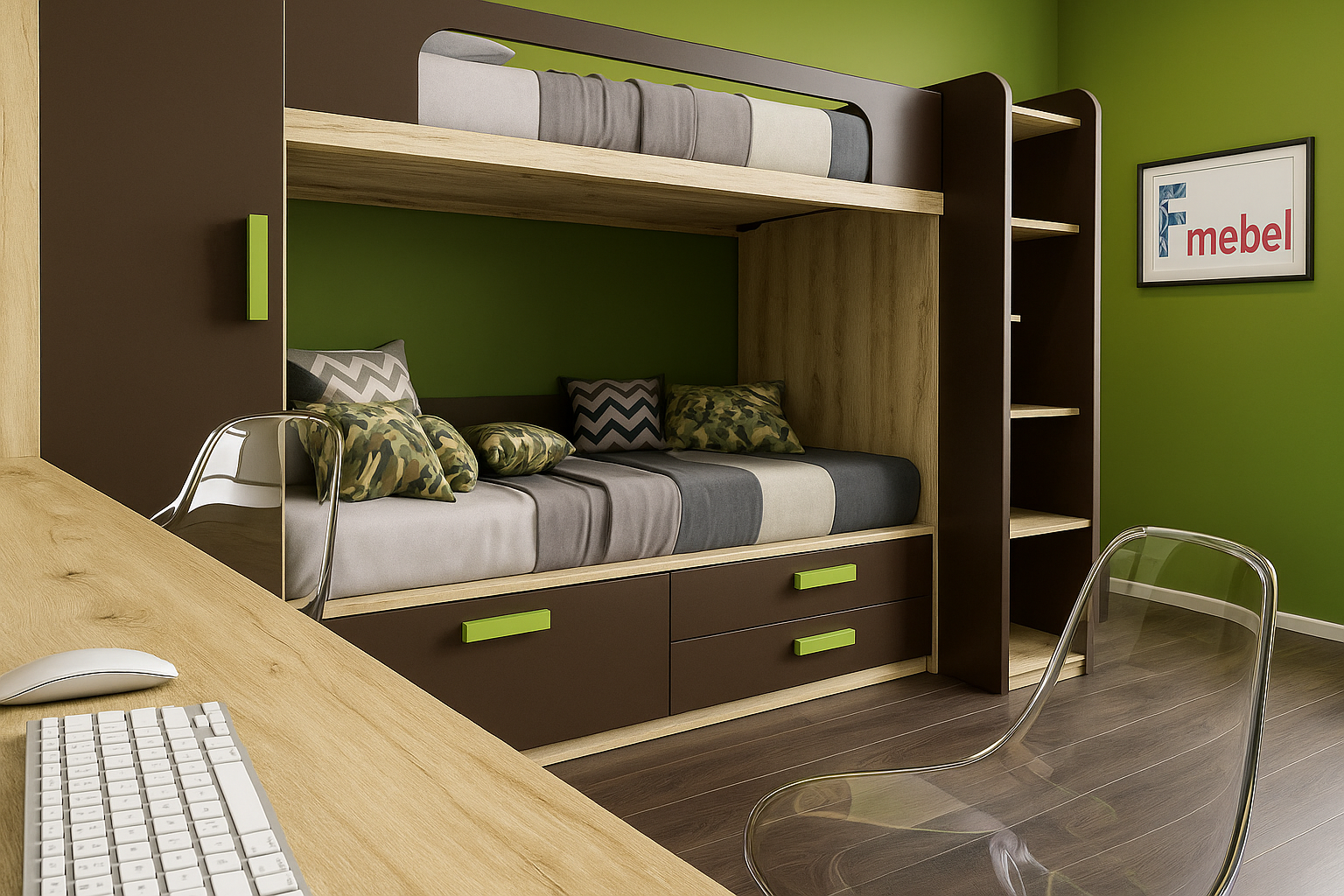 2. Стандарт: ДСП 18 мм, кромка 2 и 1 мм, телескопические направляющие, классические петли, присутствуют декоративные вырезы, скругления в столах, полочках, бортах, ступеньках. Мебель выглядит как на фото и является более интересной и комфортной. Ящики закрываются более тихо и плавно. Используется высококачественная фурнитура ТМ Muller, которая имеет гарантию 10 лет. Рекомендованная нагрузка на спальное место до 120 кг.