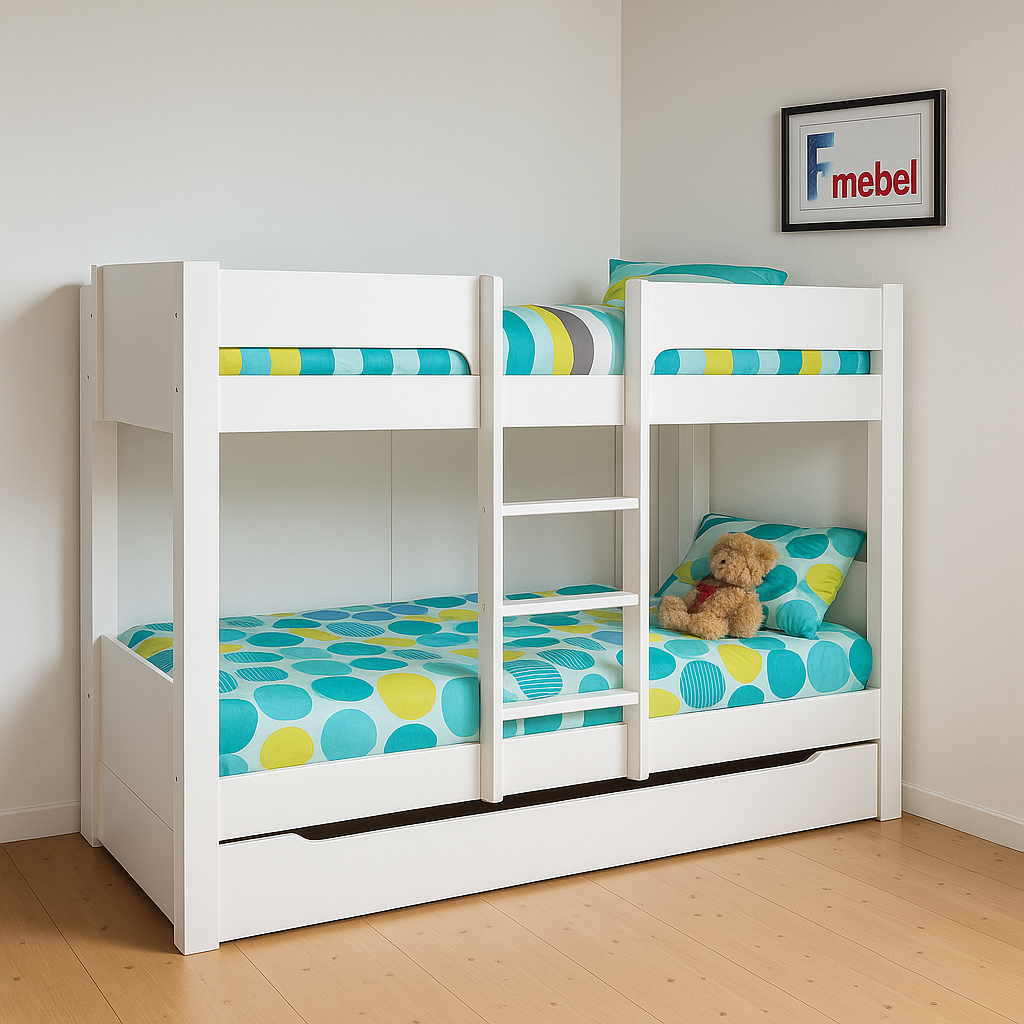 2. Стандарт: ДСП 18 мм, кромка 2 и 1 мм, телескопические направляющие, классические петли, присутствуют декоративные вырезы, скругления в столах, полочках, бортах, ступеньках. Мебель выглядит как на фото и является более интересной и комфортной. Ящики закрываются более тихо и плавно. Используется высококачественная фурнитура ТМ Muller, которая имеет гарантию 10 лет. Рекомендованная нагрузка на спальное место до 120 кг.