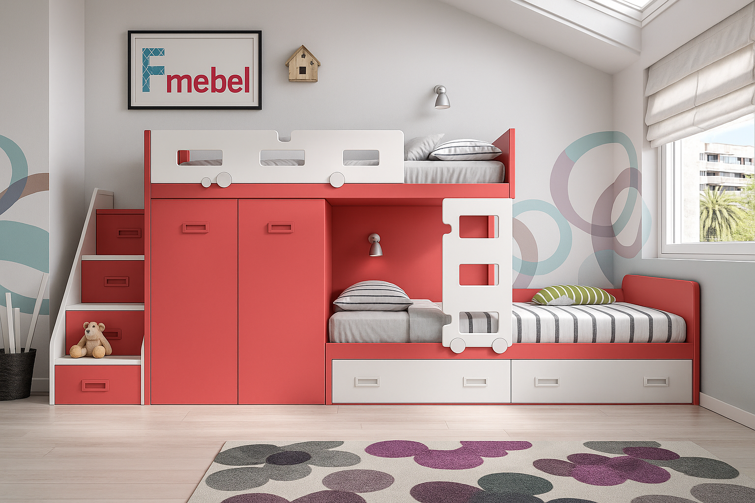 В стоимость входит: двухъярусная кровать со шкафом и лестницей-комодом, подкроватные ящики