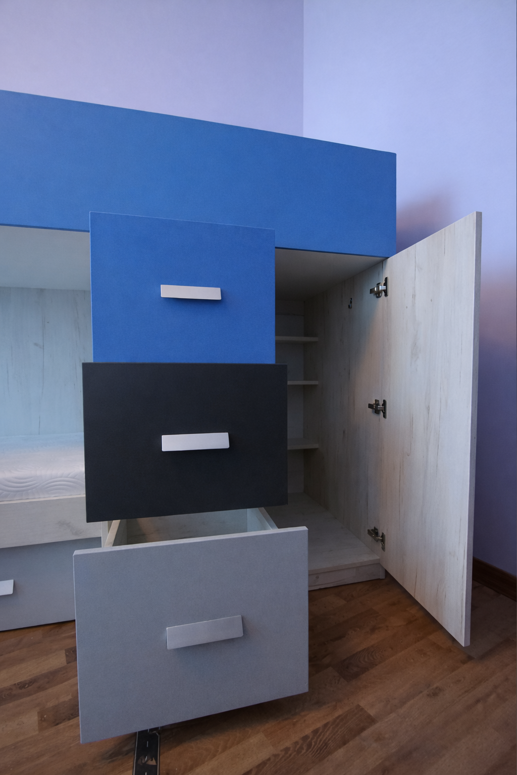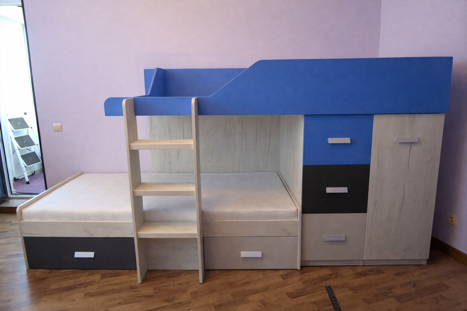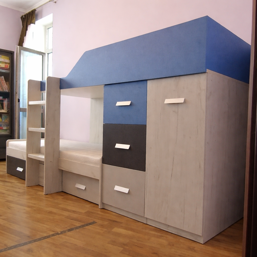 4. Люкс: ДСП 18 мм, кромка 2 и 1 мм, телескопические направляющие с доводчиком, петли с доводчиком, присутствуют декоративные вырезы, скругления в столах, полочках, бортах, ступеньках. Мебель не только выглядит и является массивной и презентабельной, но также она становится максимально комфортной в использовании — ящики закрываются почти сами - их нужно только слегка толкнуть, двери не хлопают при закрывании. Используется высококачественная фурнитура ТМ Muller, которая имеет гарантию 10 лет. Рекомендованная нагрузка на спальное место до 120 кг.
