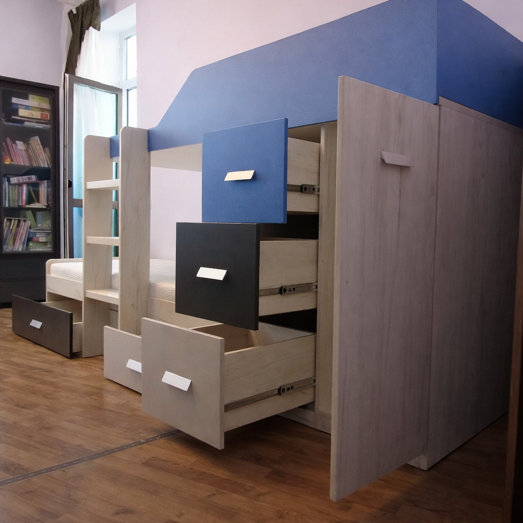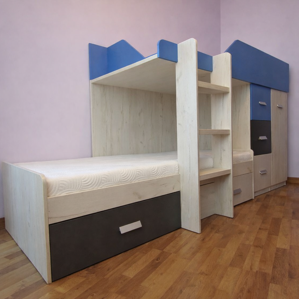 2. Стандарт: ДСП 18 мм, кромка 2 и 1 мм, телескопические направляющие, классические петли, присутствуют декоративные вырезы, скругления в столах, полочках, бортах, ступеньках. Мебель выглядит как на фото и является более интересной и комфортной. Ящики закрываются более тихо и плавно. Используется высококачественная фурнитура ТМ Muller, которая имеет гарантию 10 лет. Рекомендованная нагрузка на спальное место до 120 кг.