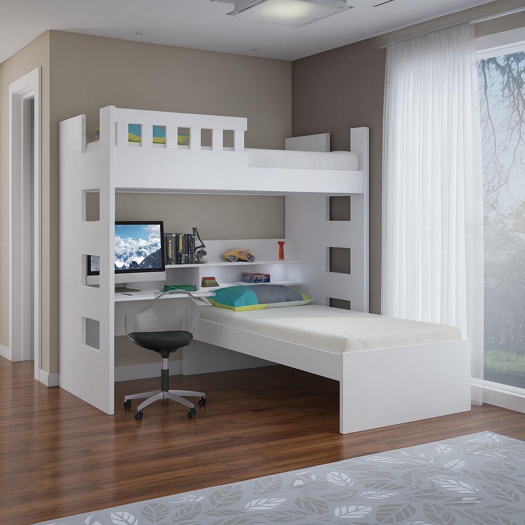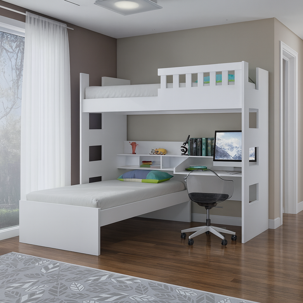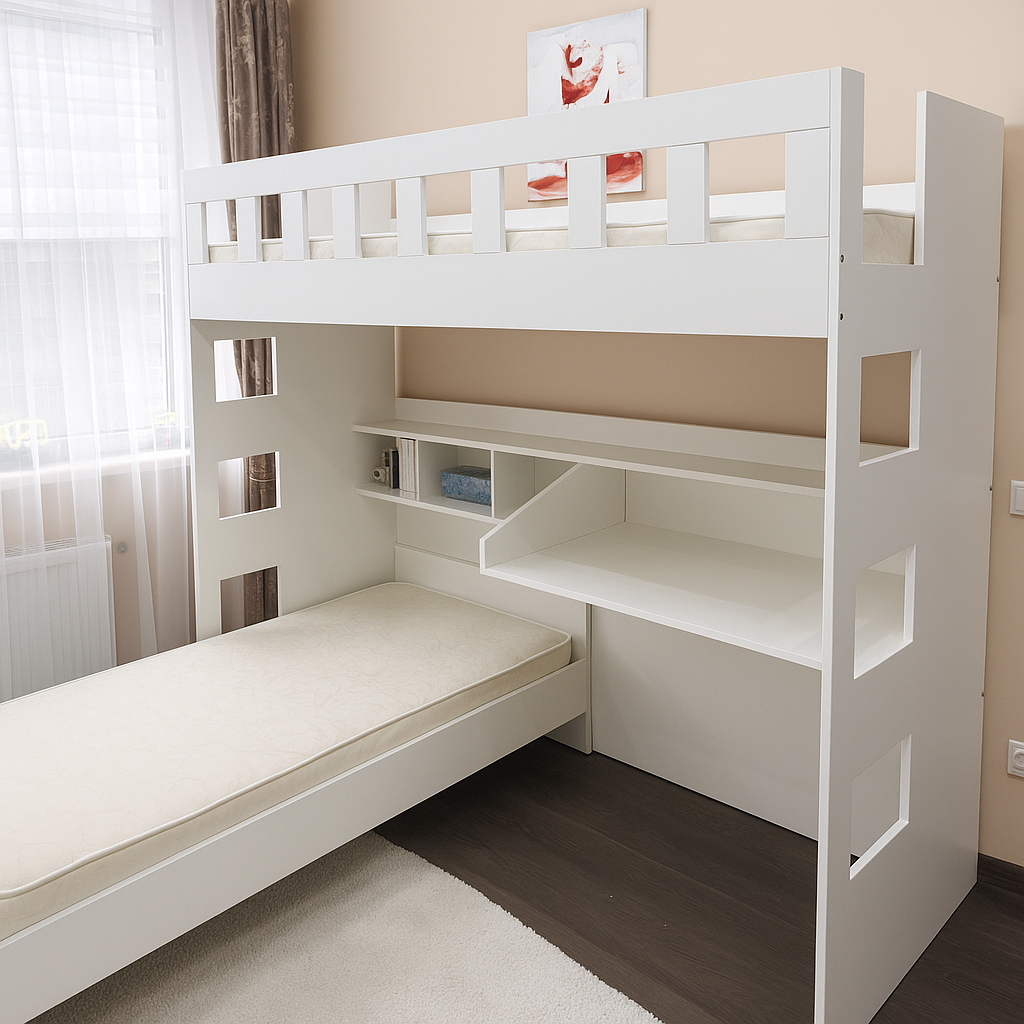 2. Стандарт: ДСП 18 мм, кромка 2 и 1 мм, телескопические направляющие, классические петли, присутствуют декоративные вырезы, скругления в столах, полочках, бортах, ступеньках. Мебель выглядит как на фото и является более интересной и комфортной. Ящики закрываются более тихо и плавно. Используется высококачественная фурнитура ТМ Muller, которая имеет гарантию 10 лет. Рекомендованная нагрузка на спальное место до 120 кг.