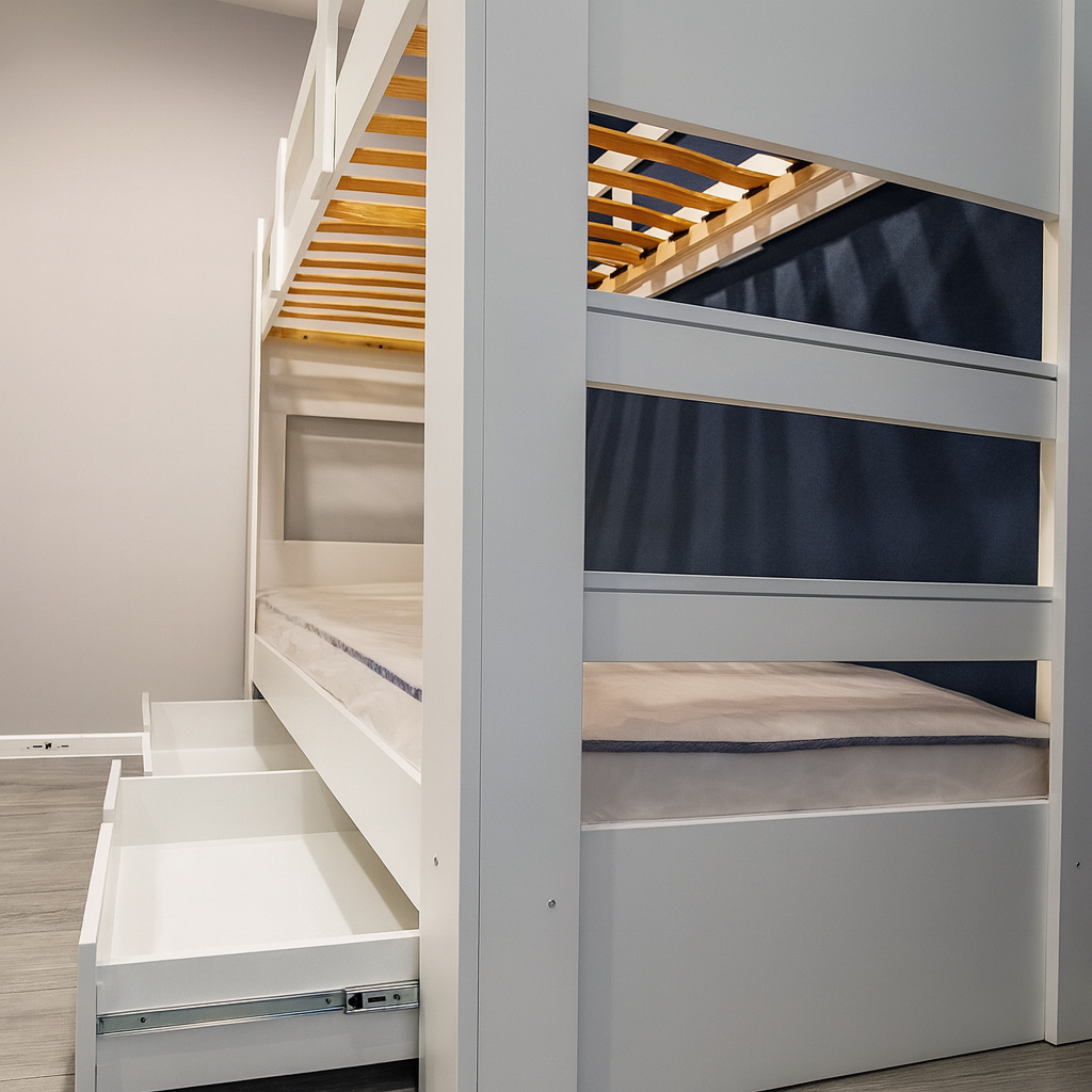 2. Стандарт: ДСП 18 мм, кромка 2 и 1 мм, телескопические направляющие, классические петли, присутствуют декоративные вырезы, скругления в столах, полочках, бортах, ступеньках. Мебель выглядит как на фото и является более интересной и комфортной. Ящики закрываются более тихо и плавно. Используется высококачественная фурнитура ТМ Muller, которая имеет гарантию 10 лет. Рекомендованная нагрузка на спальное место до 120 кг.