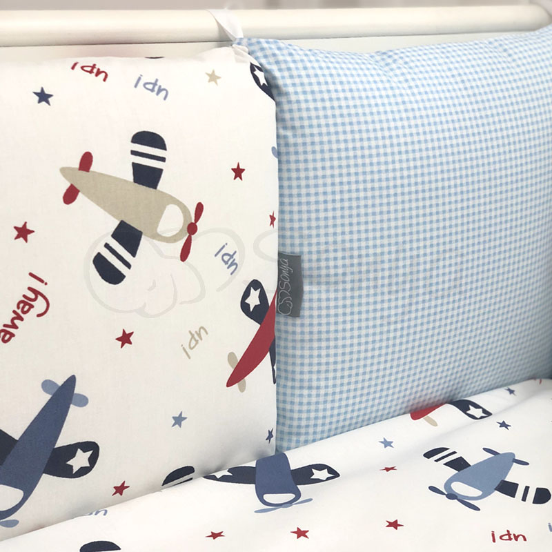 Пододеяльник, наволочка, простынь и съемные чехлы на молнии, из натуральной хлопчатобумажной ткани. Простынка идеально повторяет форму матраса в кроватке. Ребенок будет чувствовать себя свободно, а маме можно быть спокойной, что простынка зафиксирована и нигде не сомнется. Съемные чехлы имеют петельки и специальные завязочки для надежного крепления к кроватке, что гарантирует безопасность ребенка и аккуратный внешний вид. Такая защита обеспечивает отличную циркуляцию воздуха в кроватке и оберегает малыша от сквозняков и нежелательных ушибов. Наличие молнии на хлопковых чехлах бортиков, позволяет стирать отдельно чехлы и наполнитель.
