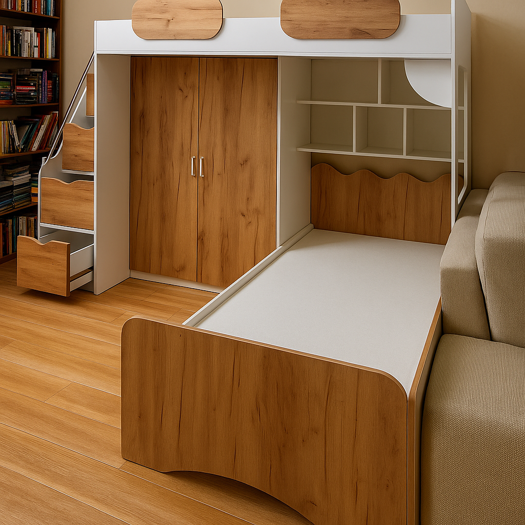 2. Стандарт: ДСП 18 мм, кромка 2 и 1 мм, телескопические направляющие, классические петли, присутствуют декоративные вырезы, скругления в столах, полочках, бортах, ступеньках. Мебель выглядит как на фото и является более интересной и комфортной. Ящики закрываются более тихо и плавно. Используется высококачественная фурнитура ТМ Muller, которая имеет гарантию 10 лет. Рекомендованная нагрузка на спальное место до 120 кг.