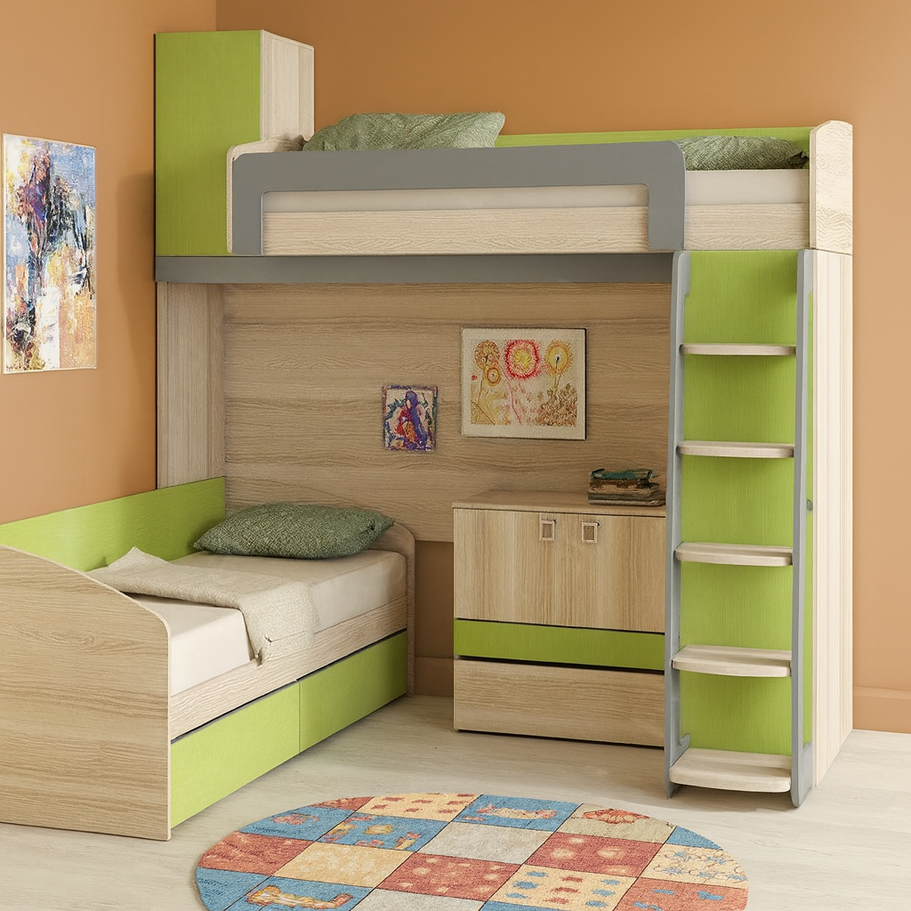 2. Стандарт: ДСП 18 мм, кромка 2 и 1 мм, телескопические направляющие, классические петли, присутствуют декоративные вырезы, скругления в столах, полочках, бортах, ступеньках. Мебель выглядит как на фото и является более интересной и комфортной. Ящики закрываются более тихо и плавно. Используется высококачественная фурнитура ТМ Muller, которая имеет гарантию 10 лет. Рекомендованная нагрузка на спальное место до 120 кг.