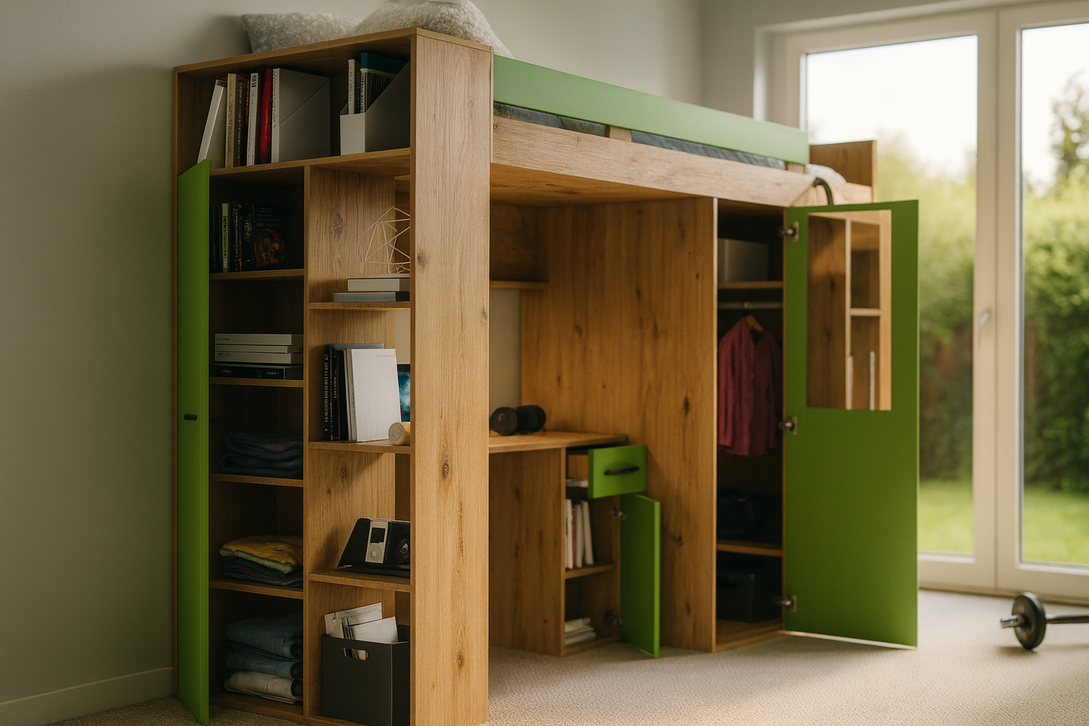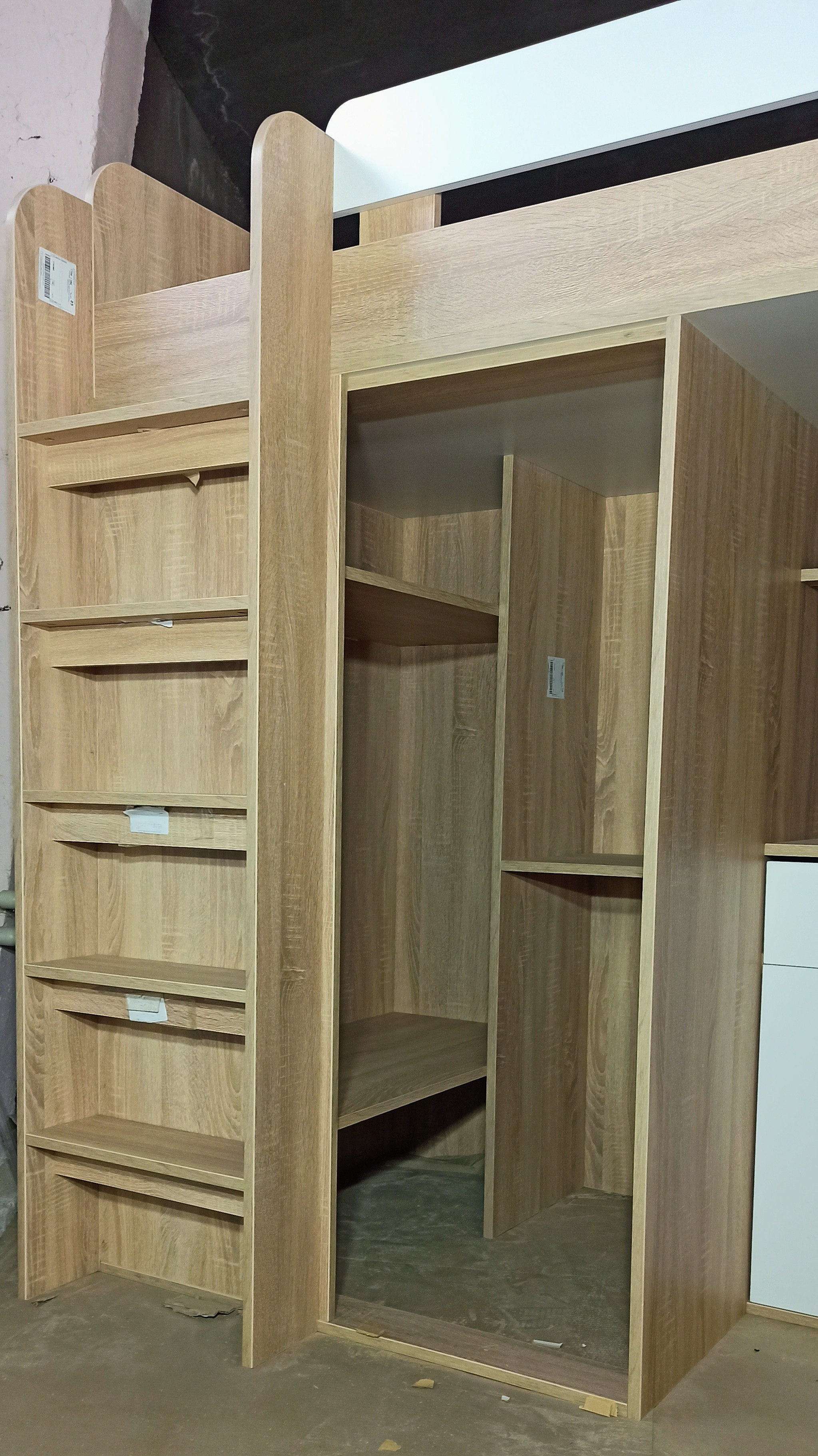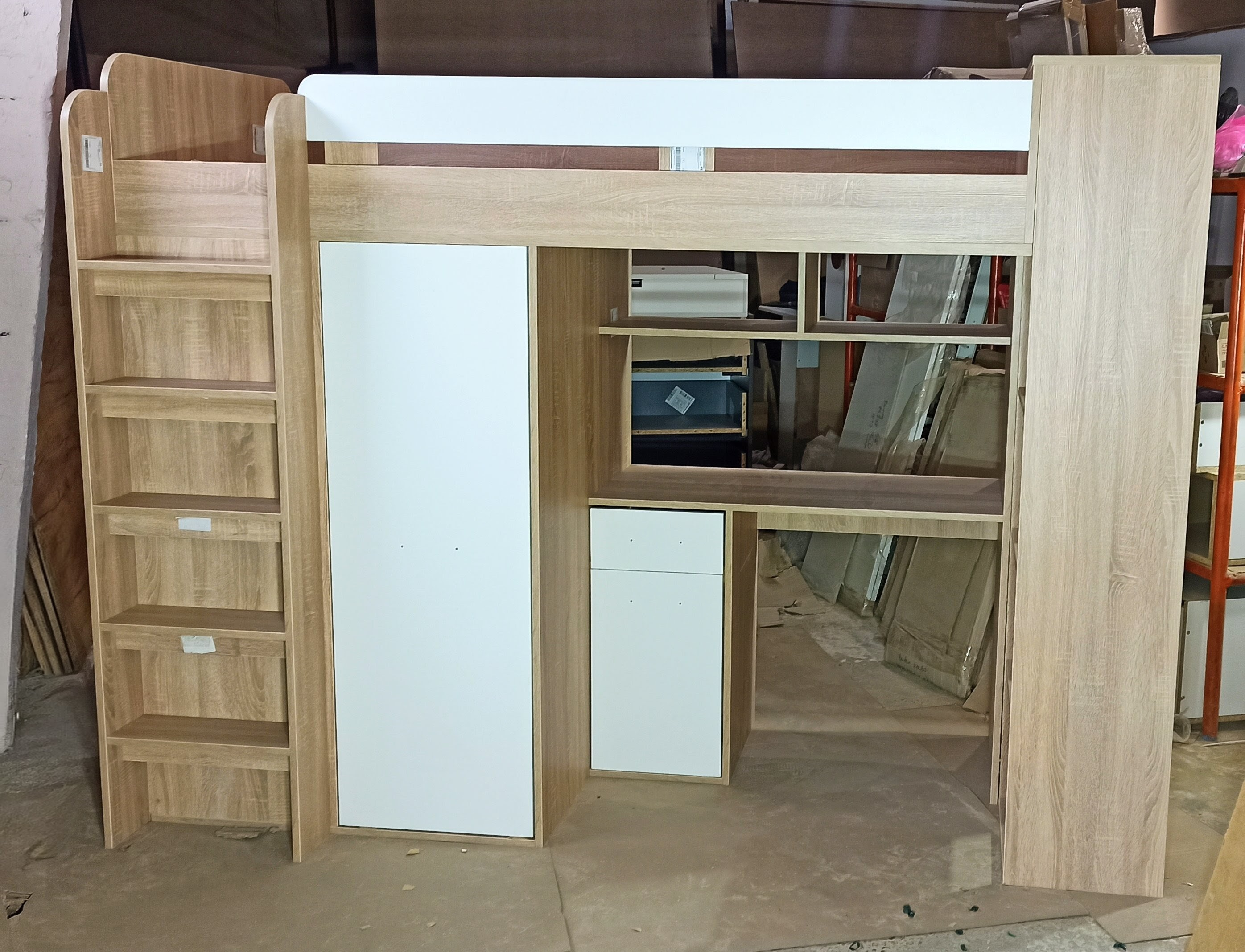 2. Стандарт: ДСП 18 мм, кромка 2 и 1 мм, телескопические направляющие, классические петли, присутствуют декоративные вырезы, скругления в столах, полочках, бортах, ступеньках. Мебель выглядит как на фото и является более интересной и комфортной. Ящики закрываются более тихо и плавно. Используется высококачественная фурнитура ТМ Muller, которая имеет гарантию 10 лет. Рекомендованная нагрузка на спальное место до 120 кг.
