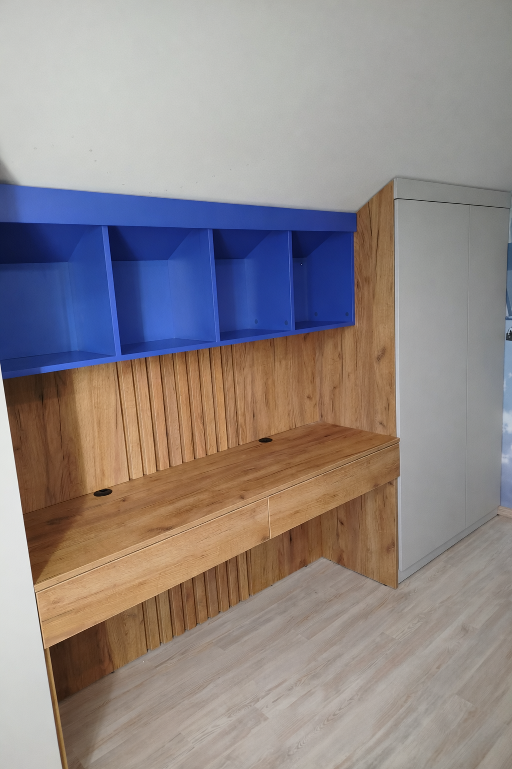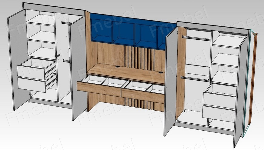 1. Базовый: ДСП 18 мм, кромка 0,6-0,8 мм, невидимые и стыковочные торцы не покрываются кромкой, телескопические направляющие, классические петли. В шкафах по умолчанию размещена только штанга для плечиков, если вам нужны полочки или ящики, они заказываются отдельной позицией. (См. доп. товары).