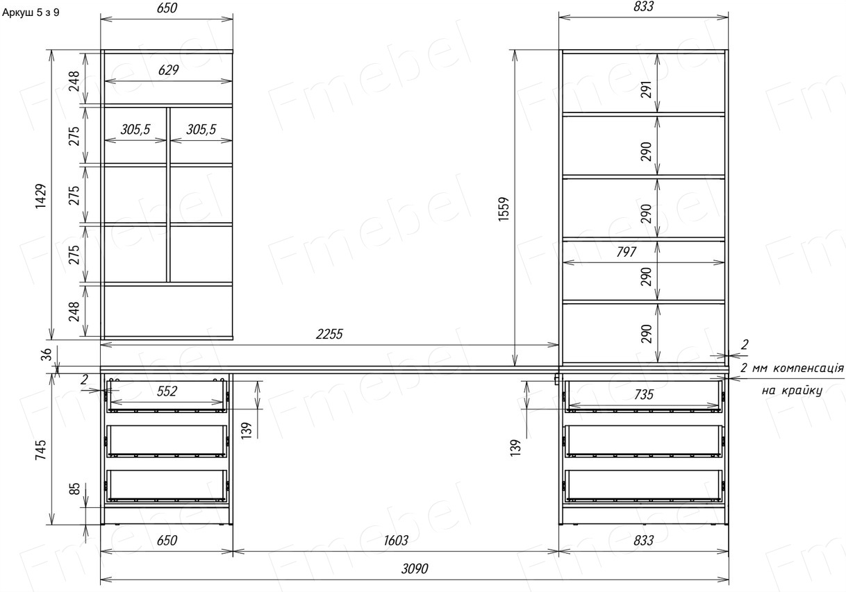 2. Стандарт: ДСП 18 мм, кромка 2 и 1 мм, телескопические направляющие Muller, классические петли. Ящики закрываются более тихо и плавно.