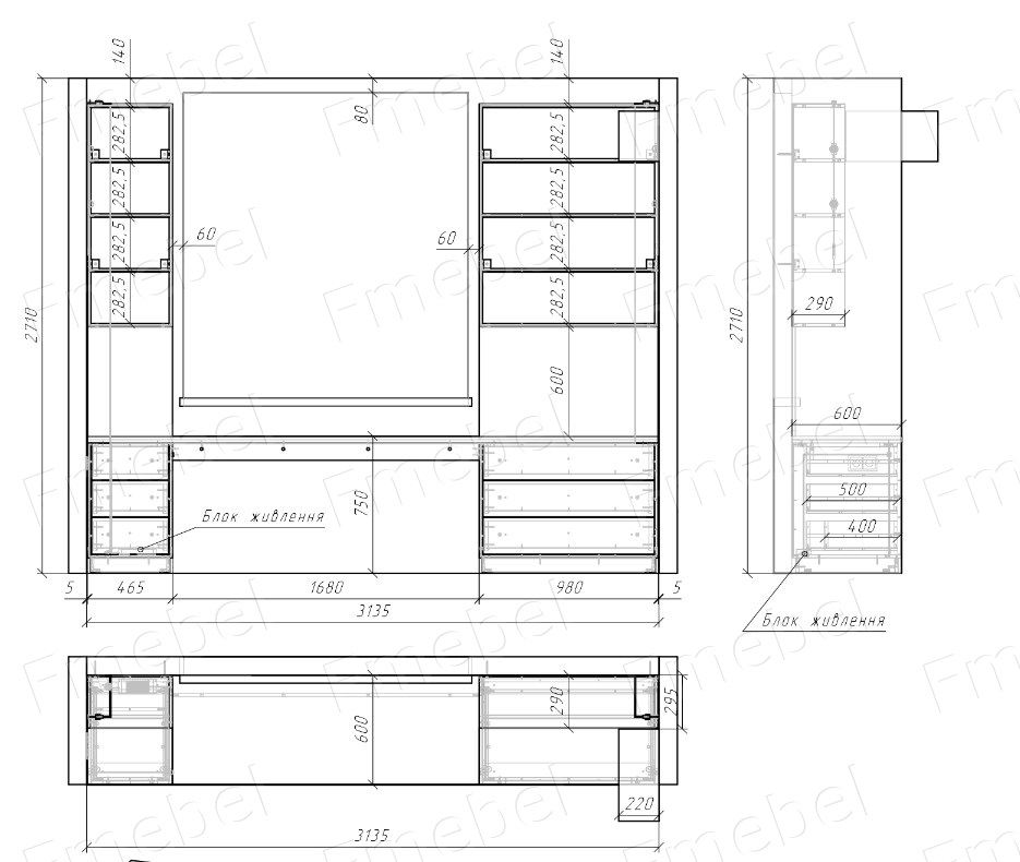 Цена указана за 1 м.п. в стоимость входит только мебель. В месте размещения телевизора, мы рекомендуем размещать стеновую панель, для того чтобы за ней скрыть все провода. Стеновая панель просчитывается отдельно. Варианты стеновых панелей и цены можно посмотреть здесь. Так же в крышке тумбы мы по вашему желанию добавляем вырез под провода, а в задней стенке делаем доступ к розеткам (пример на видео внизу описания). Высота и ширина - индивидуально по размерам клиента. Глубина навесных модулей не более 350 мм. Навесные тумбы размещаются на высоте от пола до низа тумбы - 300мм. Но также возможно индивидуальное размещение по желанию покупателя.